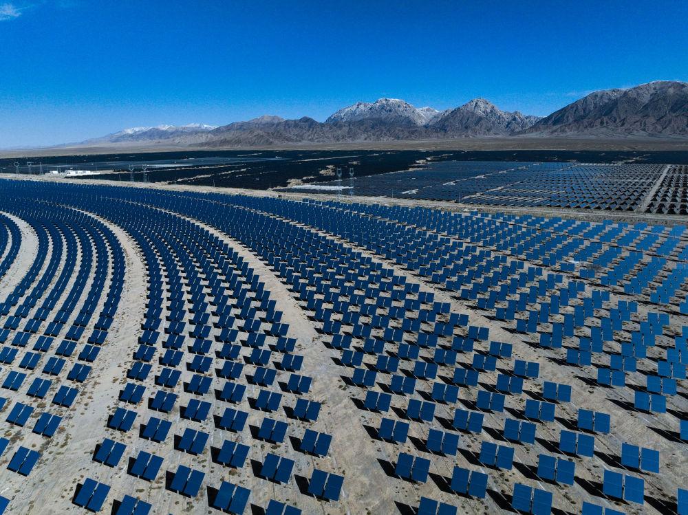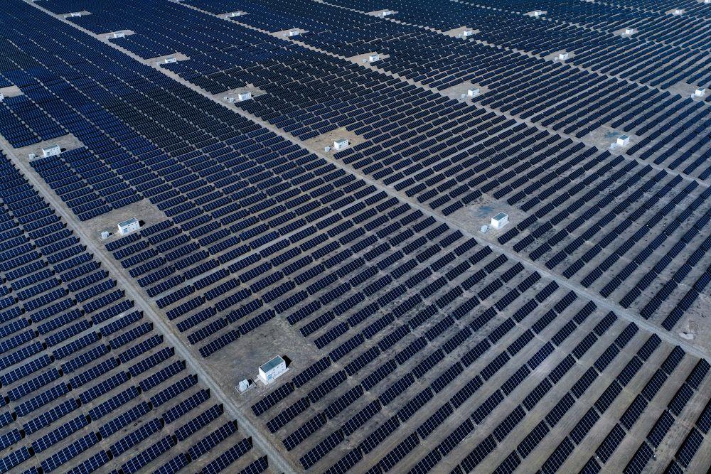 345平方公里的發(fā)電園內(nèi),超過1000萬塊光伏板高低起伏連成蔚藍(lán)色的“海洋”,年發(fā)電量超過200億千瓦時,相當(dāng)于減排二氧化碳超過2122萬噸。