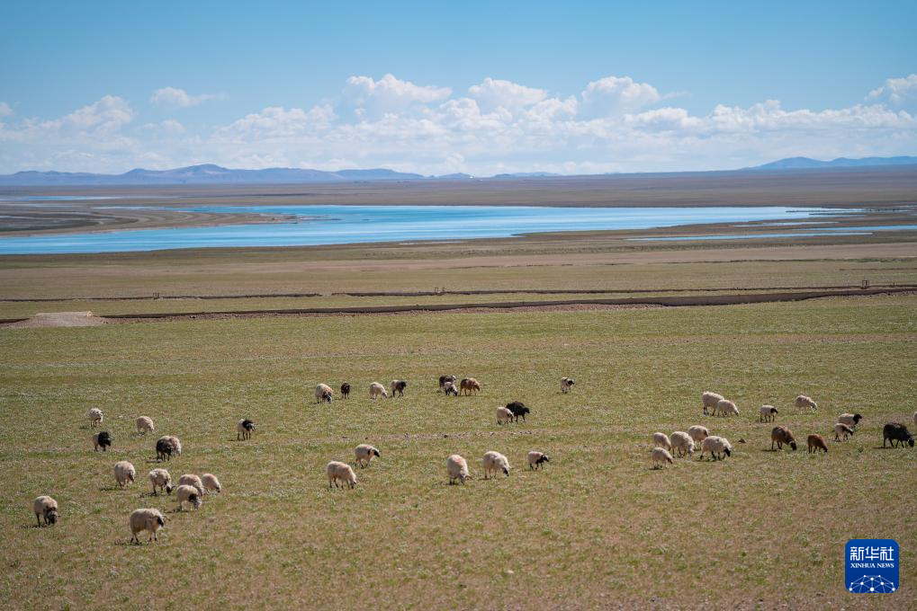 6月22日,羊群在色林錯(cuò)湖畔草場上吃草。新華社記者 丁增尼達(dá) 攝