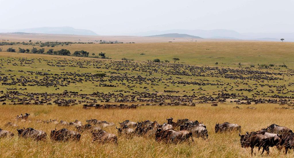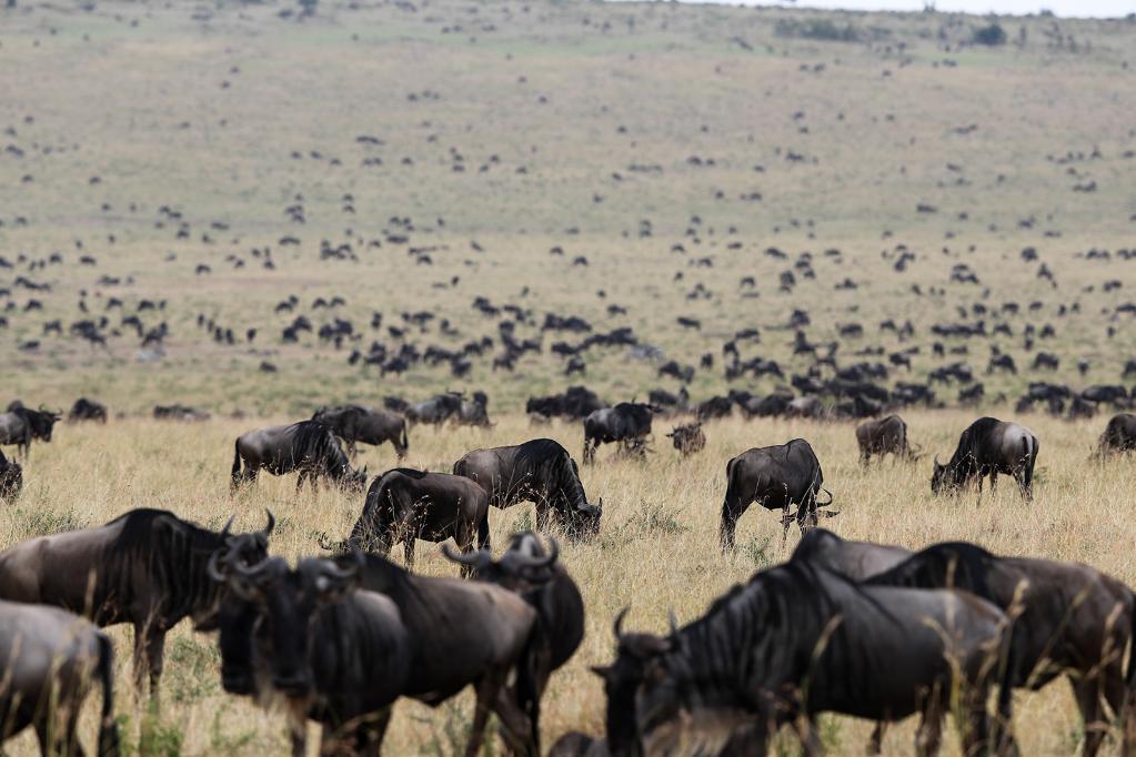 在肯尼亞馬賽馬拉國家公園內,遷徙中的角馬在草原上覓食。