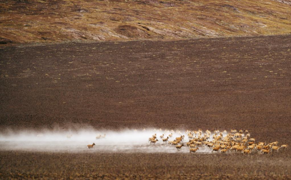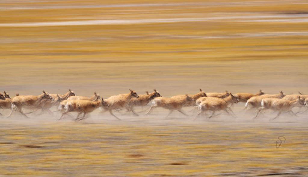 在羌塘國家級自然保護區(qū),遷徙中的藏羚羊因為感受到危險而奮力奔跑。