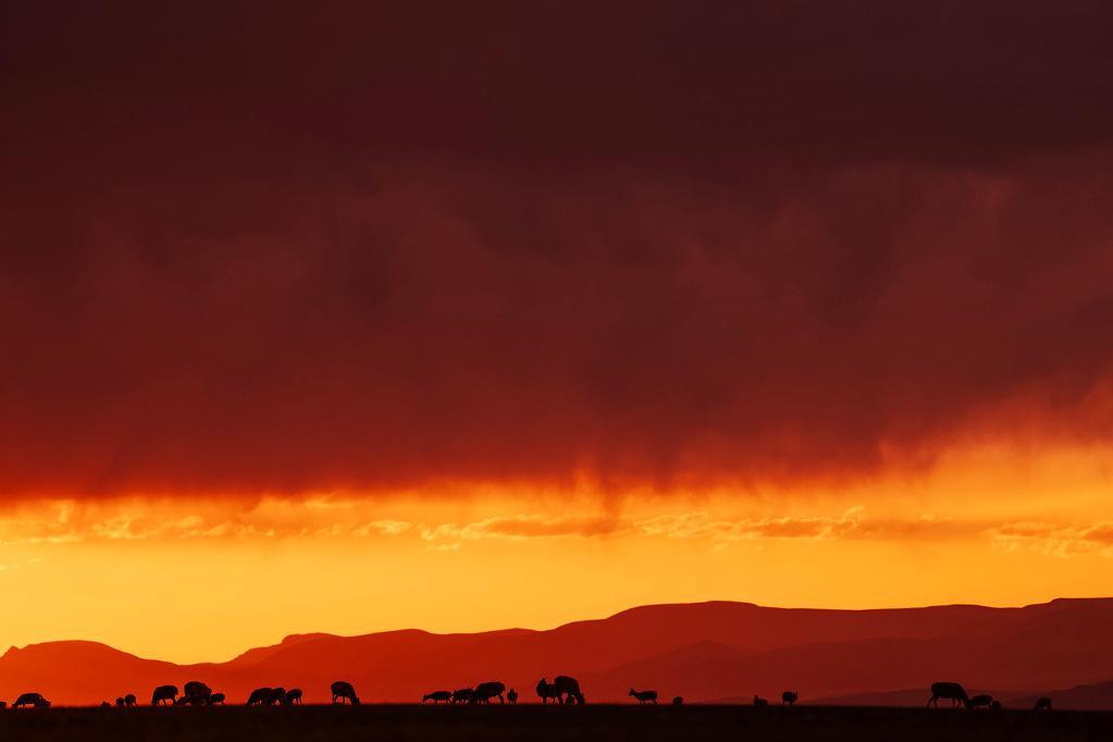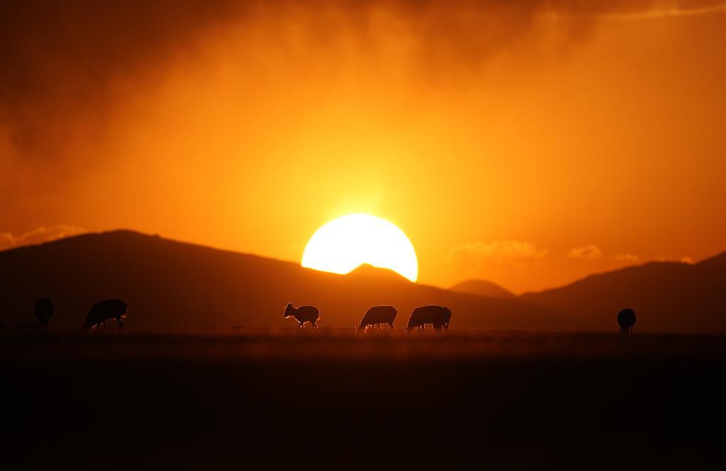 在羌塘國家級自然保護區(qū),藏羚羊在夕陽下覓食。