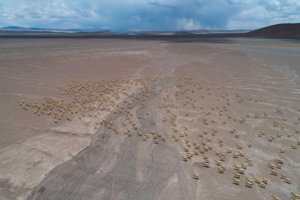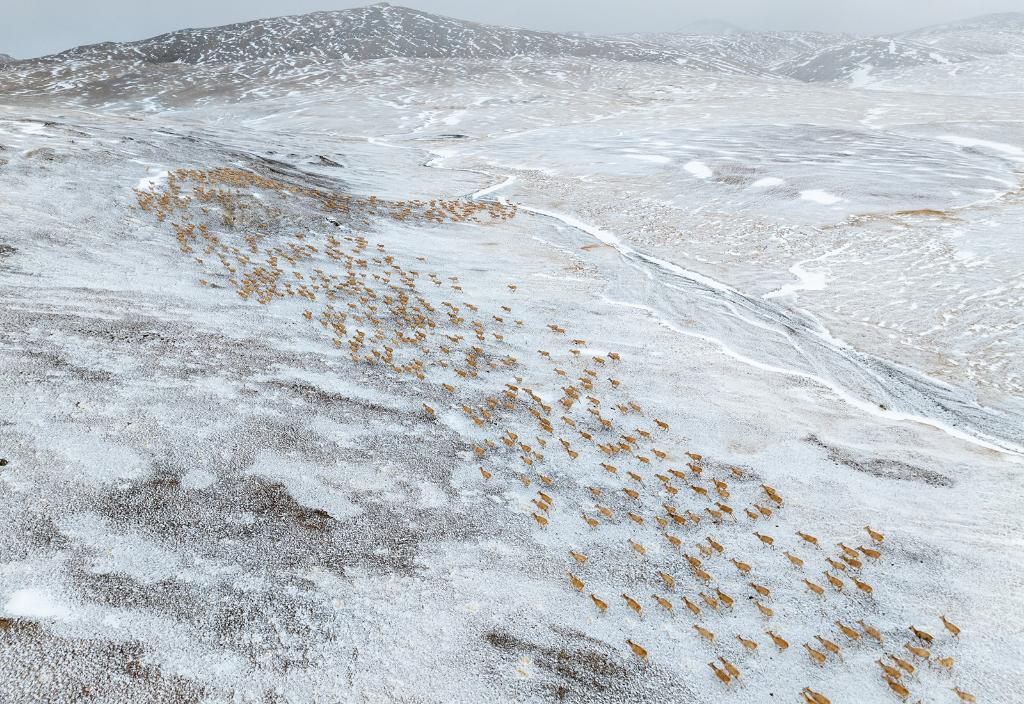 2024年5月10日,在羌塘國家級自然保護區(qū),大群懷孕的雌性藏羚羊開始集結成群,向產羔地遷徙。