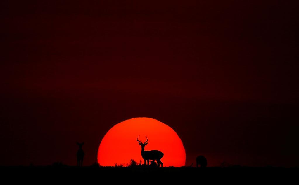 在馬賽馬拉國家保護區(qū),遷徙中的野生動物在夕陽下覓食。