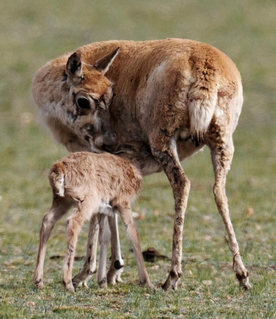 2024年6月17日,羌塘國家級自然保護區(qū)境內的西藏那曲市申扎縣買巴鄉(xiāng)魯確塘草原上一只剛出生不久的小藏羚羊在吃奶。