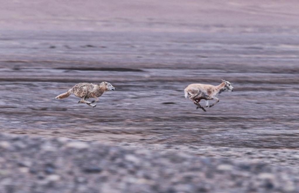 在羌塘國家級自然保護區(qū),一只野狼正在捕食遷徙中的母藏羚羊。在藏羚羊的遷徙過程中,野狼、雪豹、藏馬熊和藏野狐等掠食動物守候在遷徙路上,隨時準備捕食。
