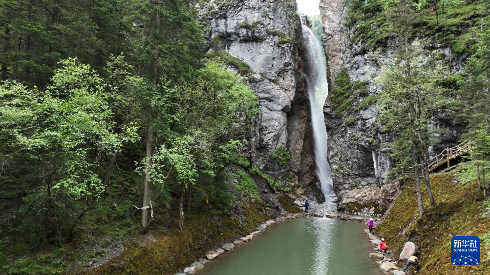 6月26日,游客在大峪溝景區(qū)內(nèi)游玩(無人機照片)。新華社記者 方欣 攝