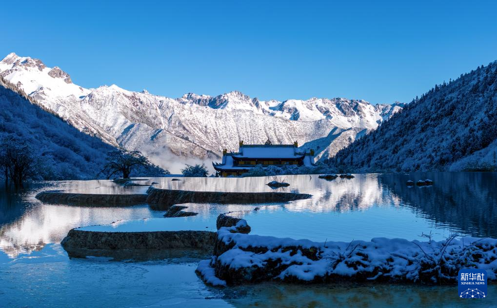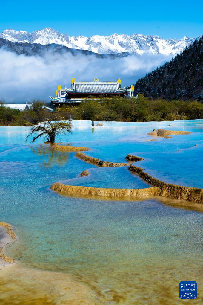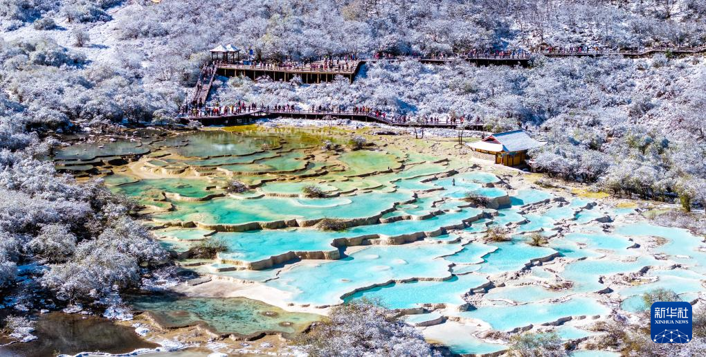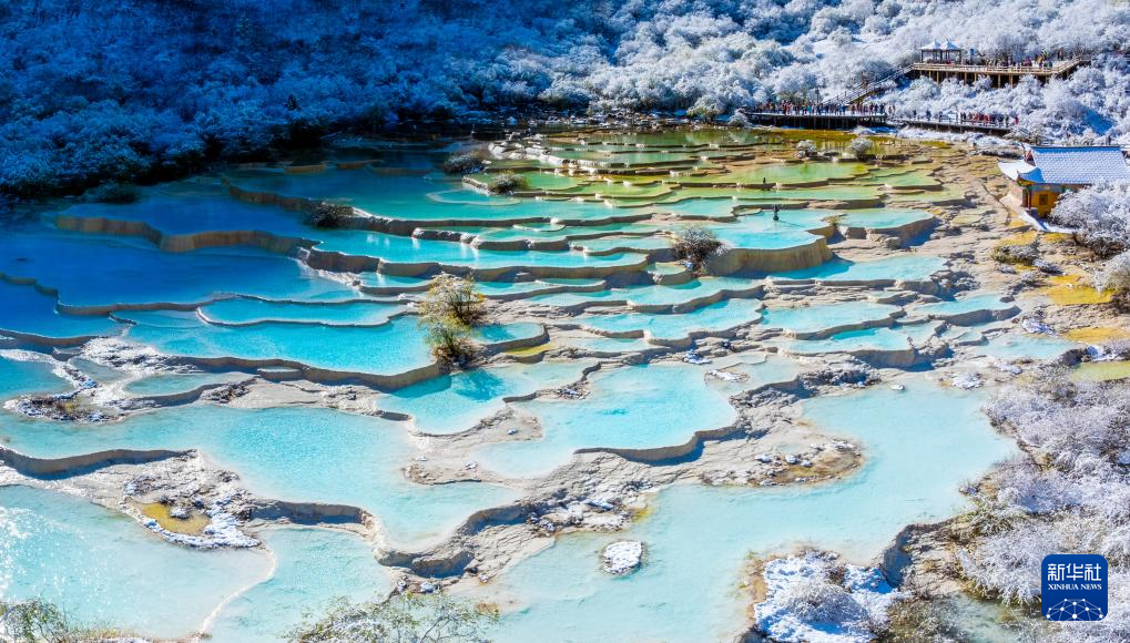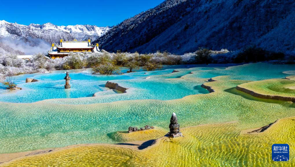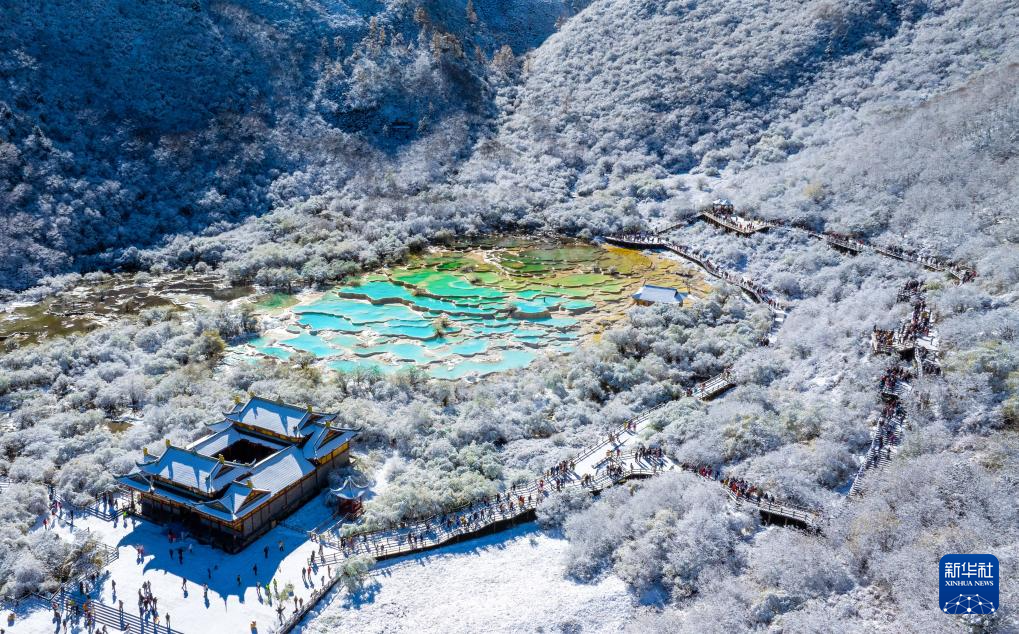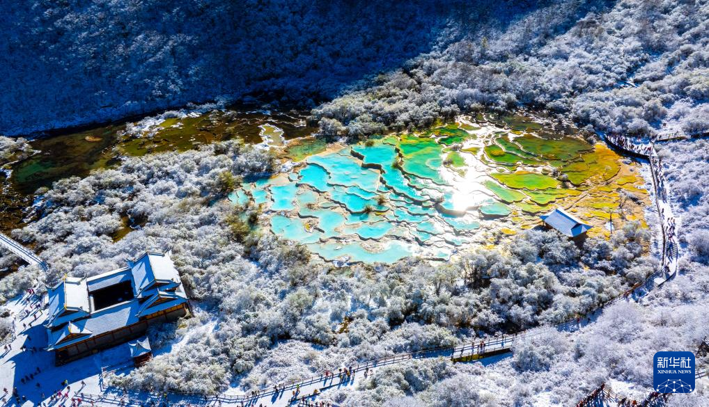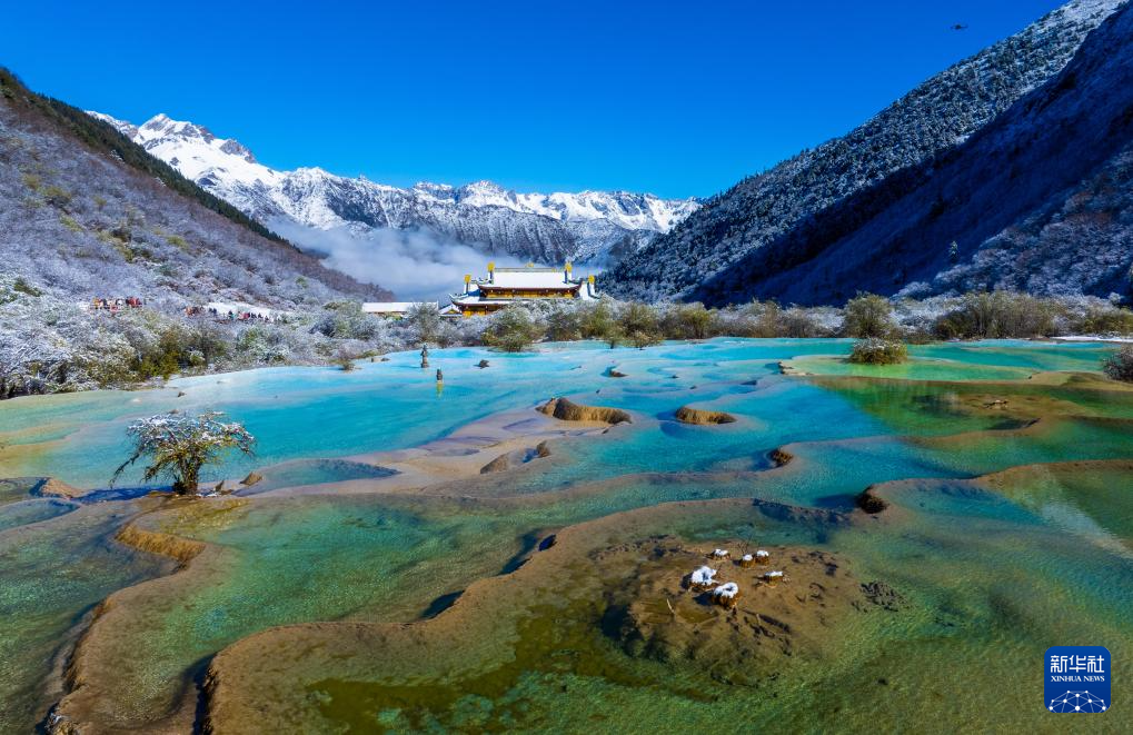 10月21日,四川省阿壩藏族羌族自治州黃龍景區(qū)迎來今秋第一場降雪,五彩池與皚皚白雪交相輝映,美不勝收。