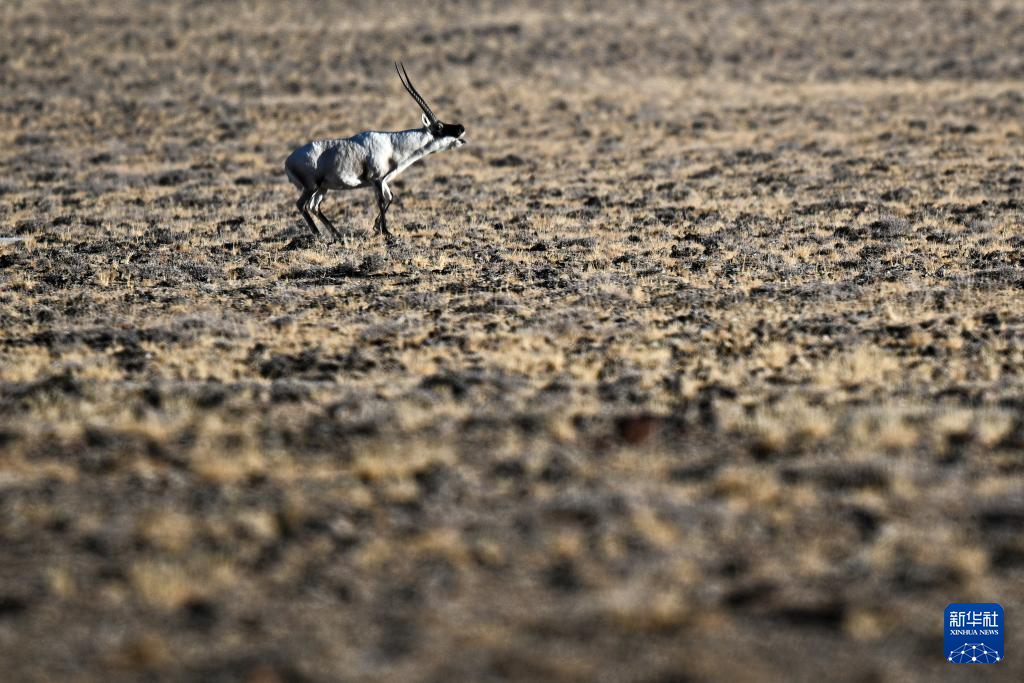 一頭雄性藏羚羊在羌塘國家級自然保護(hù)區(qū)的草原上奔跑(12月4日攝)。新華社記者 姜帆 攝