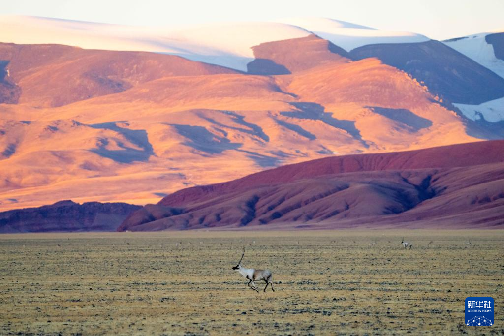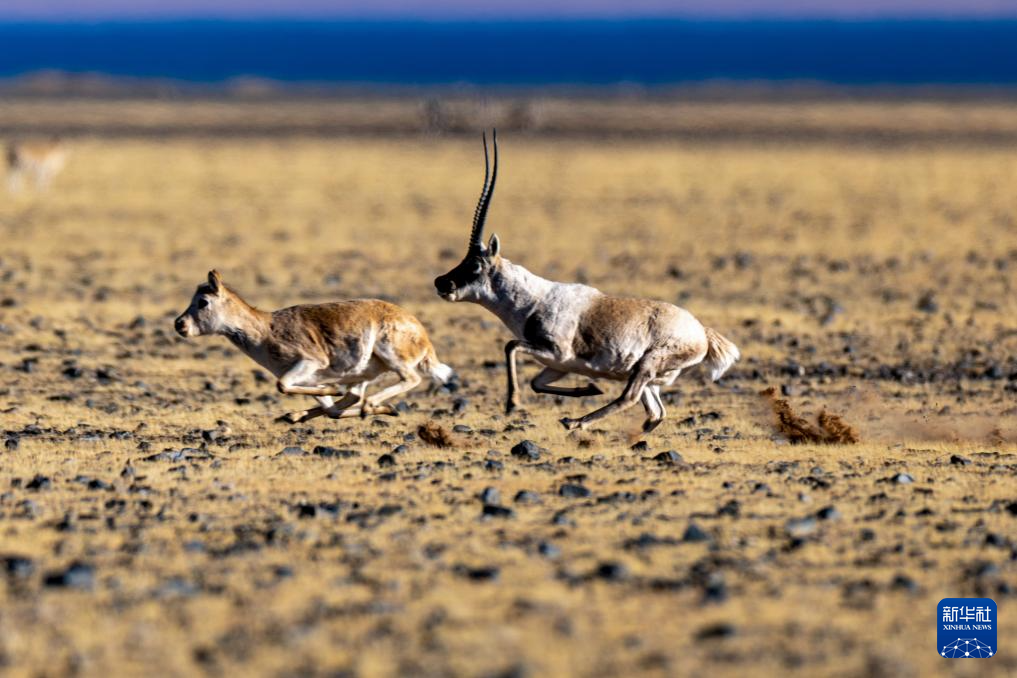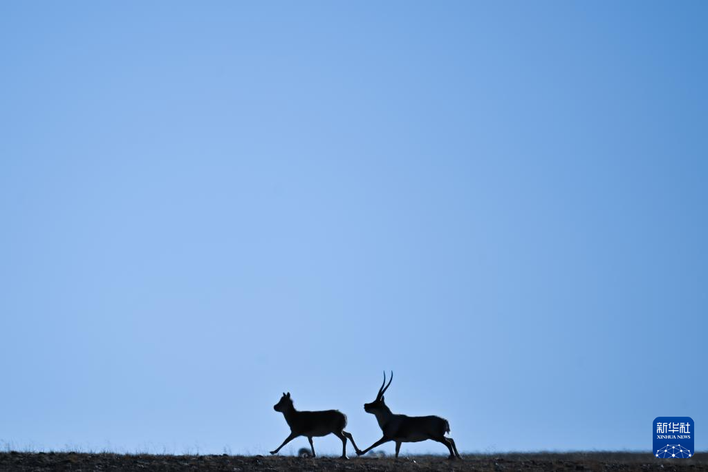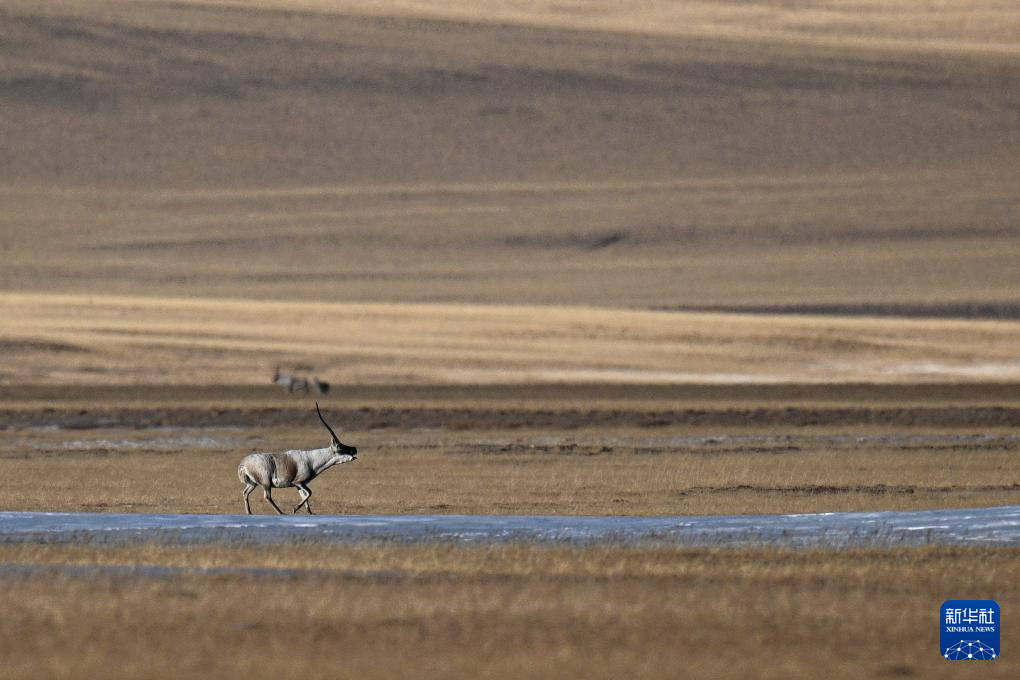 一頭雄性藏羚羊在羌塘國家級自然保護(hù)區(qū)的草原上追逐雌性藏羚羊(12月1日攝)。新華社記者 郭昱 攝