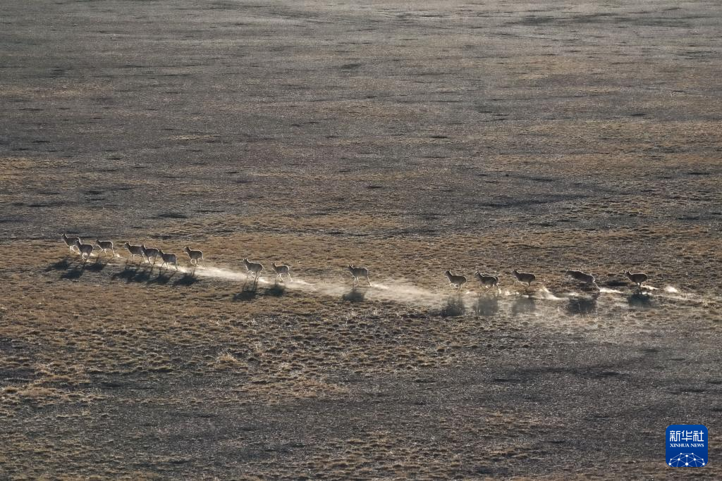 在阿爾金山國家級自然保護(hù)區(qū),一群藏羚羊在草原上奔跑(無人機(jī)照片,12月7日攝)。新華社記者 辛悅衛(wèi) 攝