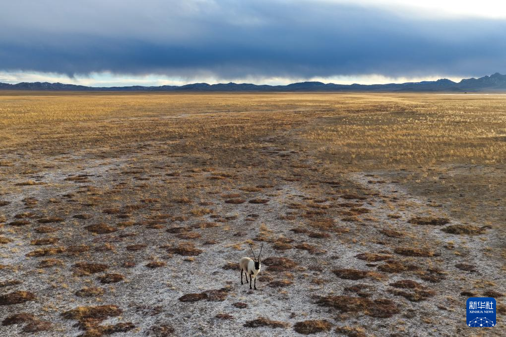 在阿爾金山國家級自然保護(hù)區(qū),一只雄性藏羚羊在覓食(12月5日攝,無人機(jī)照片)。新華社記者 辛悅衛(wèi) 攝