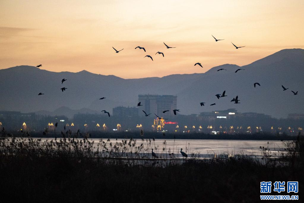 1月9日,傍晚時(shí)刻在拉薩市拉魯濕地越冬的黑頸鶴和候鳥。新華網(wǎng) 旦增努布 攝