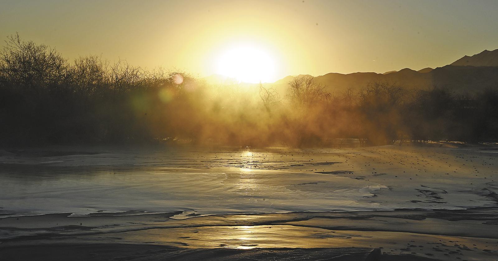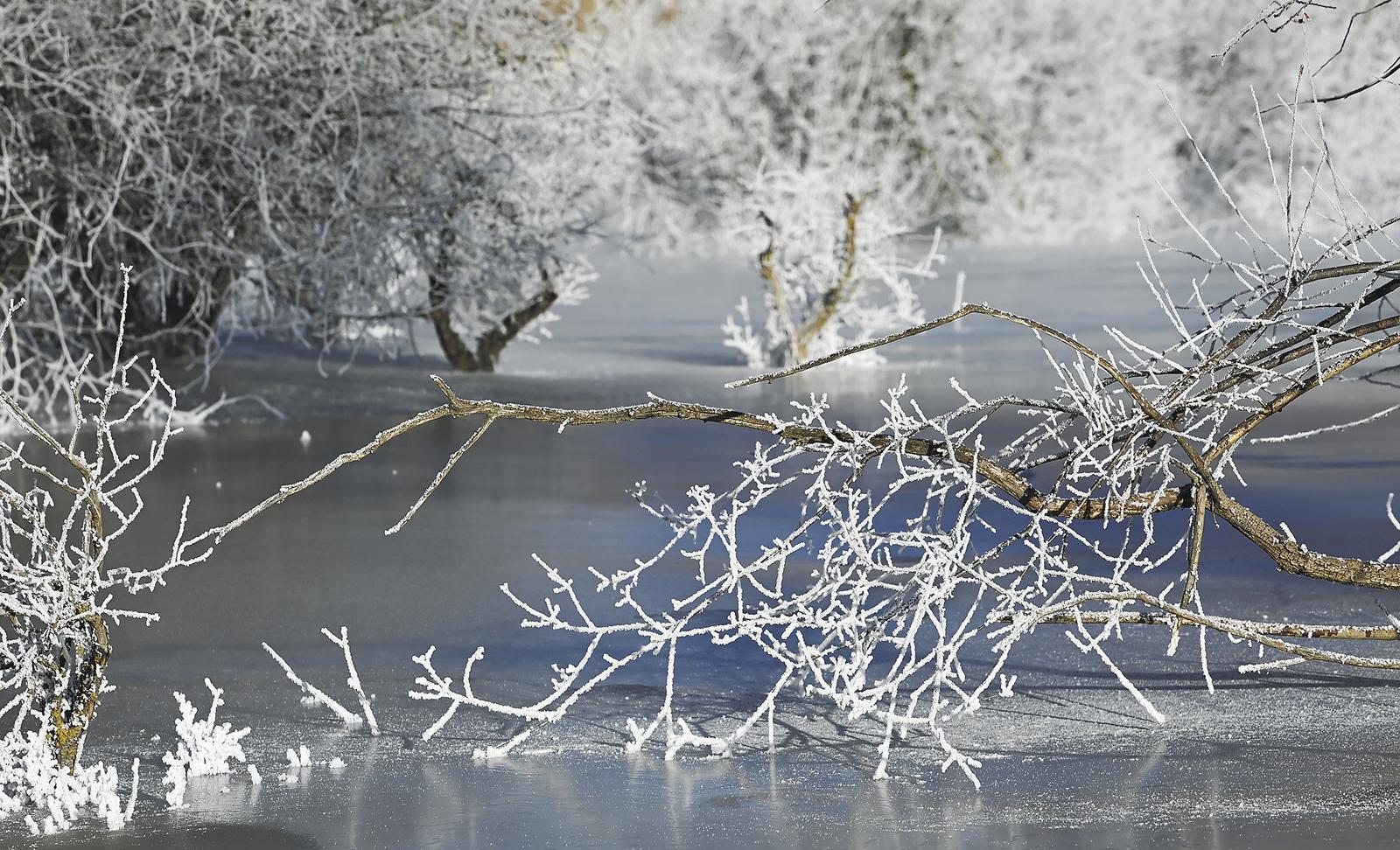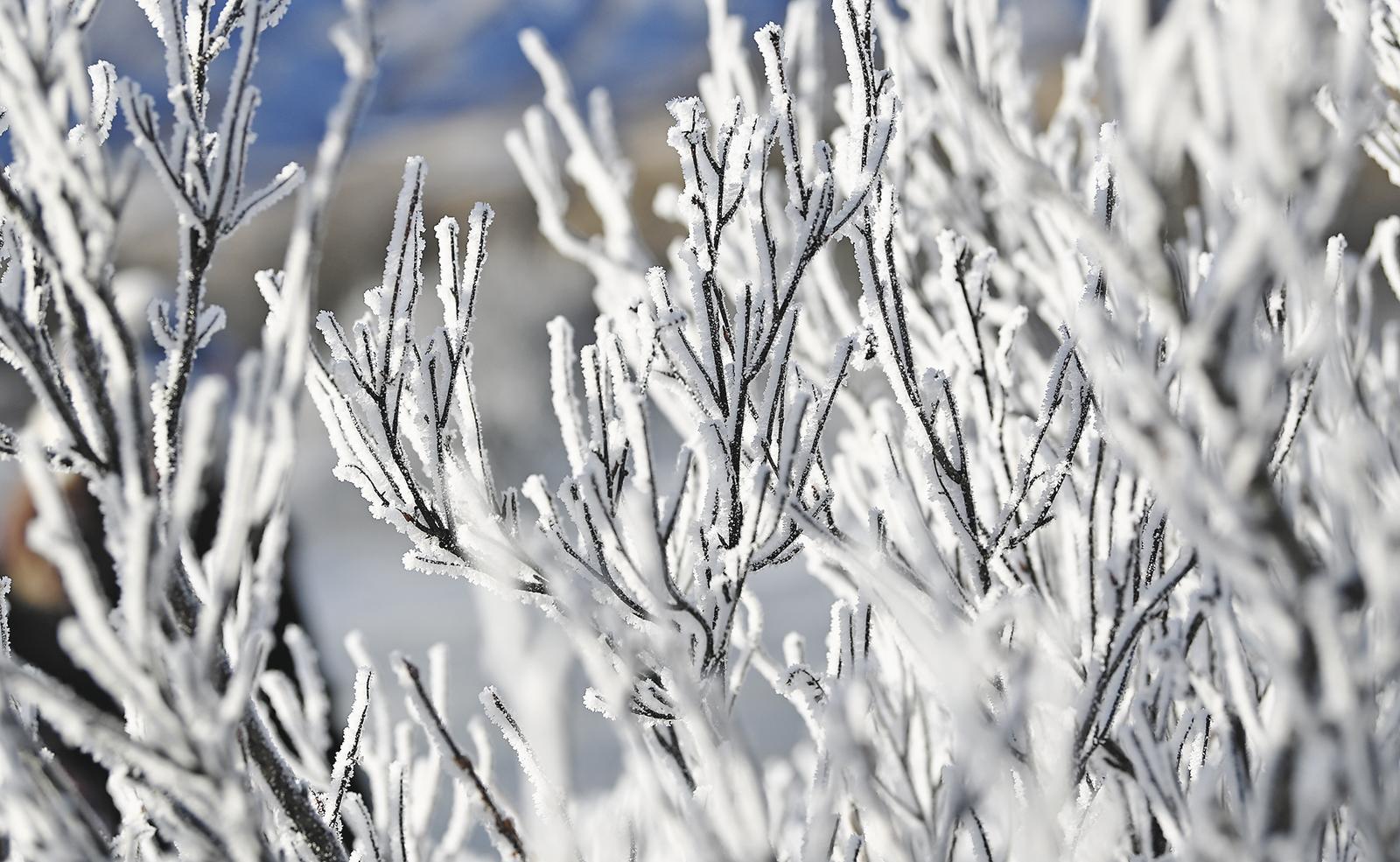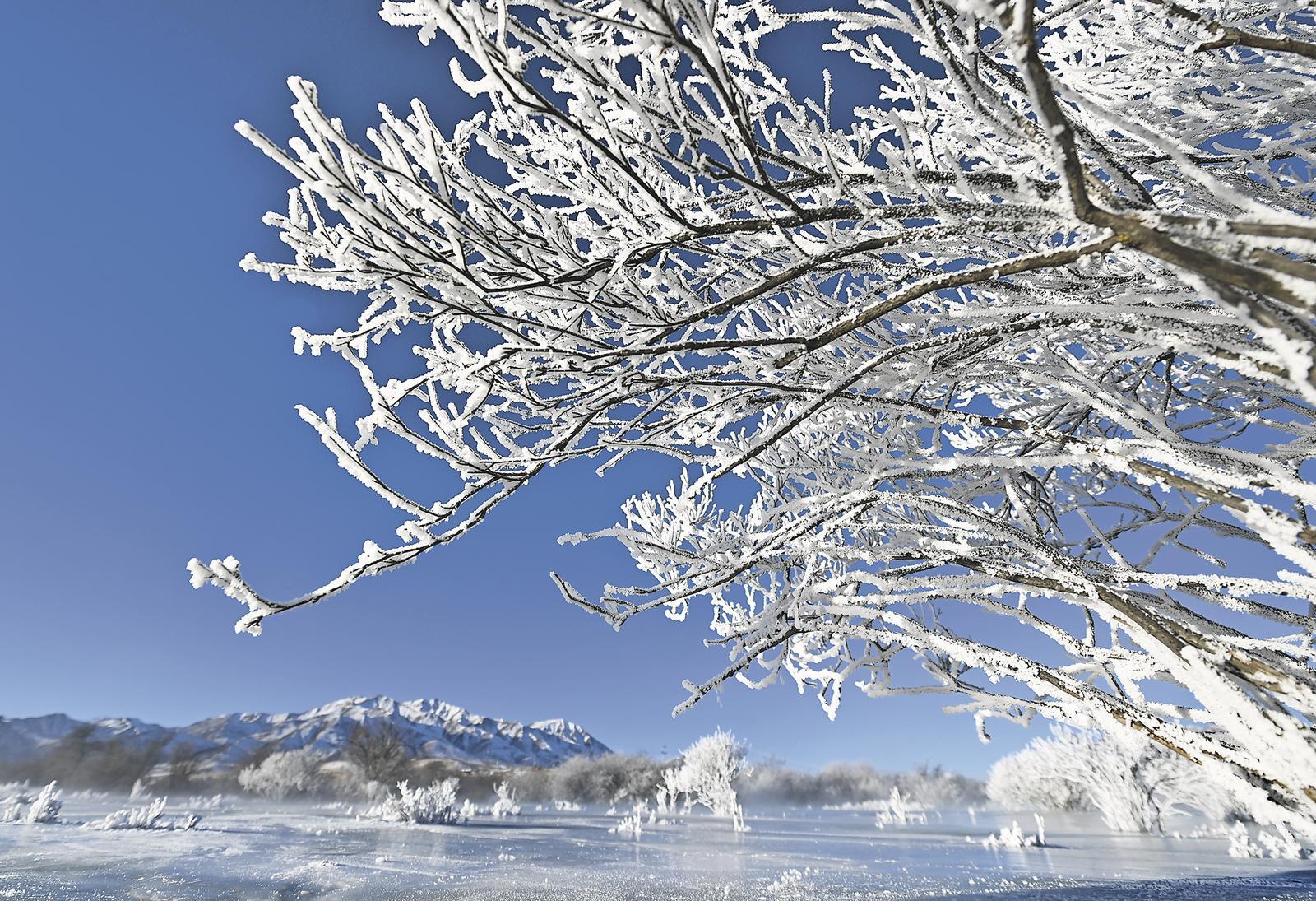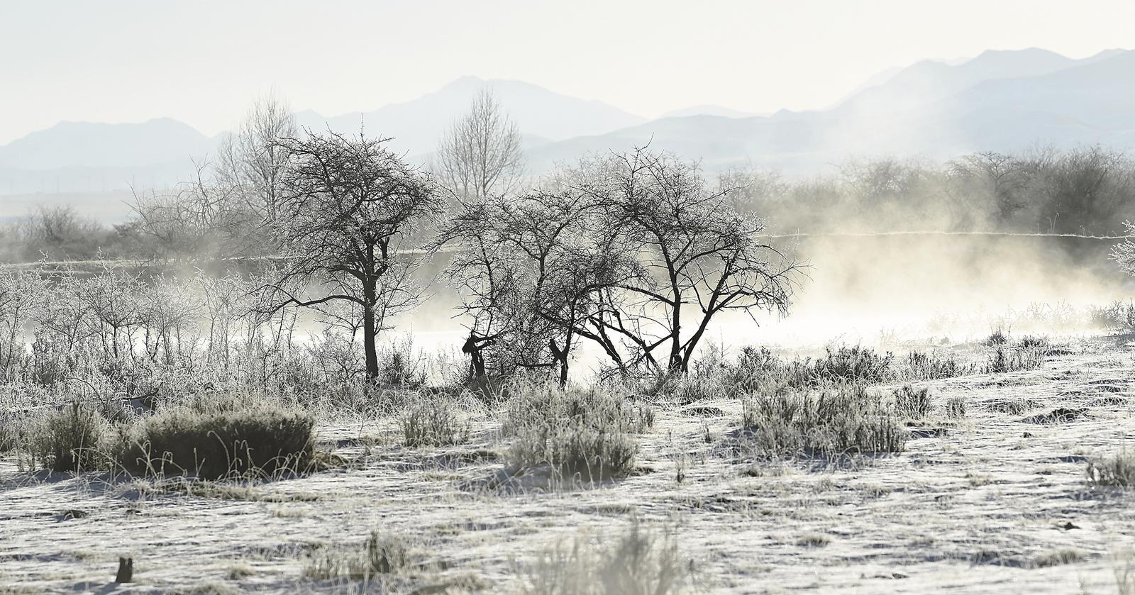 三九寒冬,清晨時分,未完全封凍的河谷蒸騰起氤氳水汽,在零下二十攝氏度以下的低溫中凝華,給樹枝裹上一層晶瑩剔透的冰晶。陽光穿透晨霧,冰晶折射出五彩光澤,與蜿蜒河流冰面、遠處祁連雪峰相映成畫,漫步其間仿佛闖入童話世界。