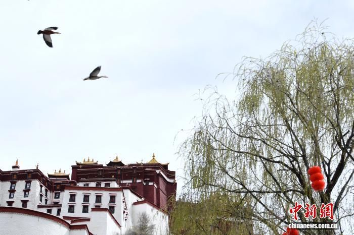 3月8日,西藏拉薩宗角祿康公園,楊柳吐綠。陽(yáng)春三月,古城拉薩桃花初放、生機(jī)盎然,春意漸濃。中新社記者 貢嘎來松 攝