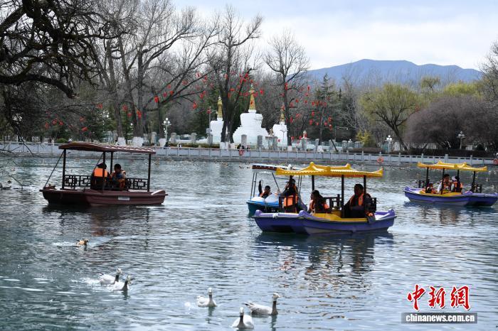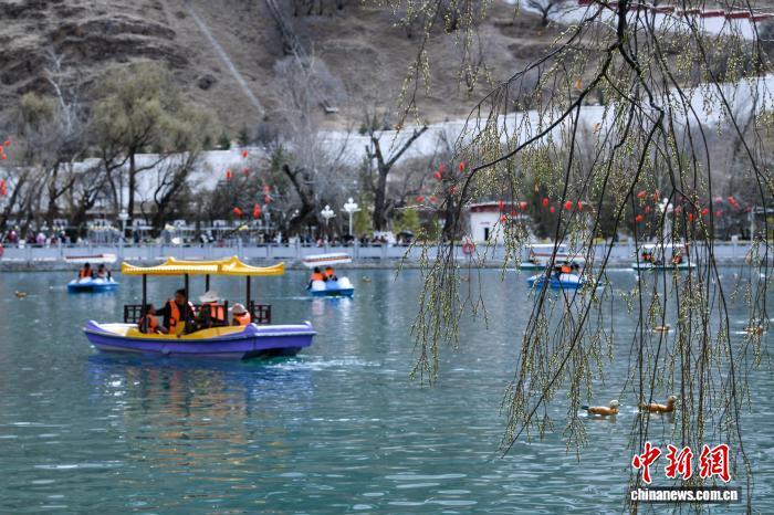 3月8日,西藏拉薩宗角祿康公園,市民乘游船賞春。陽(yáng)春三月,古城拉薩楊柳發(fā)芽、桃花初放,春意漸濃。中新社記者 貢嘎來松 攝
