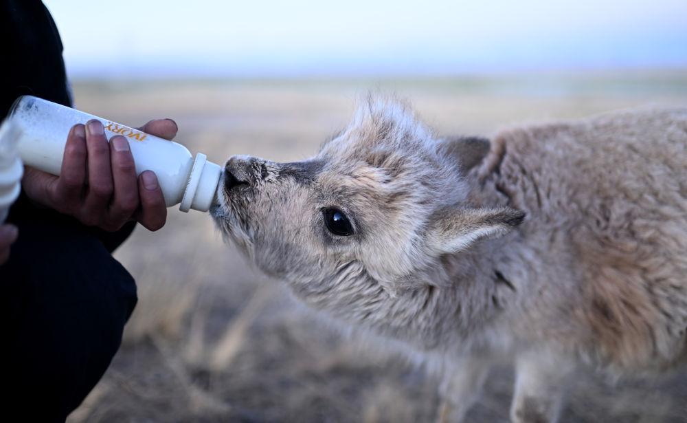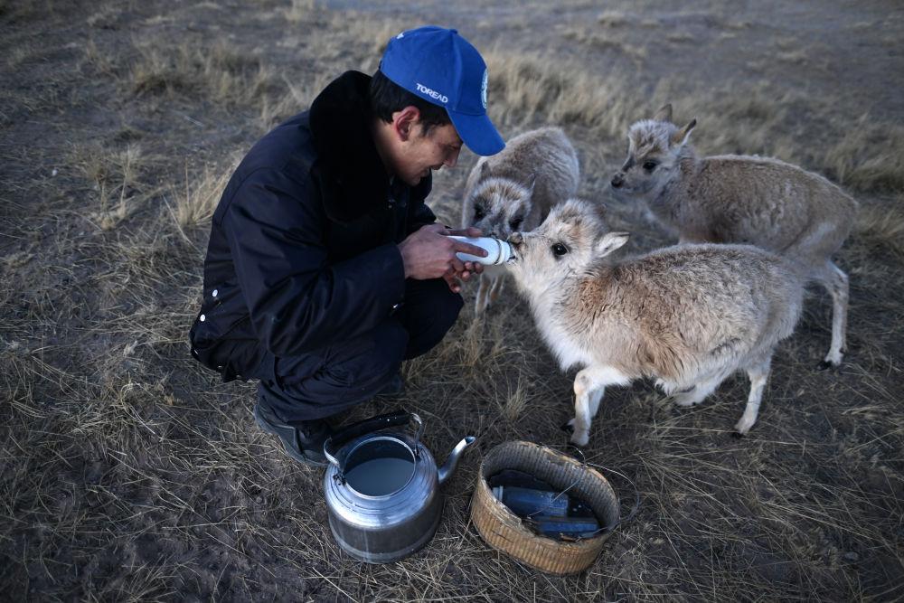 可可西里巡山隊員才文多杰在索南達杰保護站內(nèi)給被救助的藏羚羊幼仔喂奶(1月18日攝)。新華社記者 張宏祥 攝