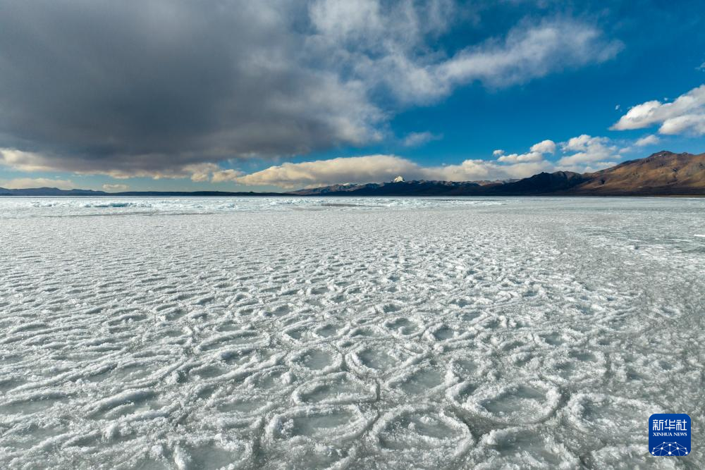 瑪旁雍錯(cuò)湖面上的冰堆積在一起,呈現(xiàn)出各式各樣的造型(1月29日攝,無人機(jī)照片)。新華社發(fā)(旦增努布攝)