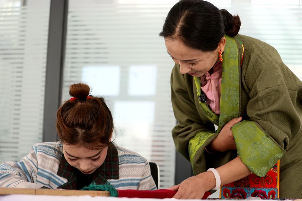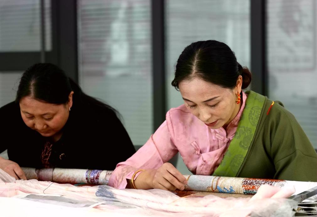 4月23日,拉毛葉忠(右一)指導(dǎo)繡娘制作藏繡作品。新華社記者 王艷 攝