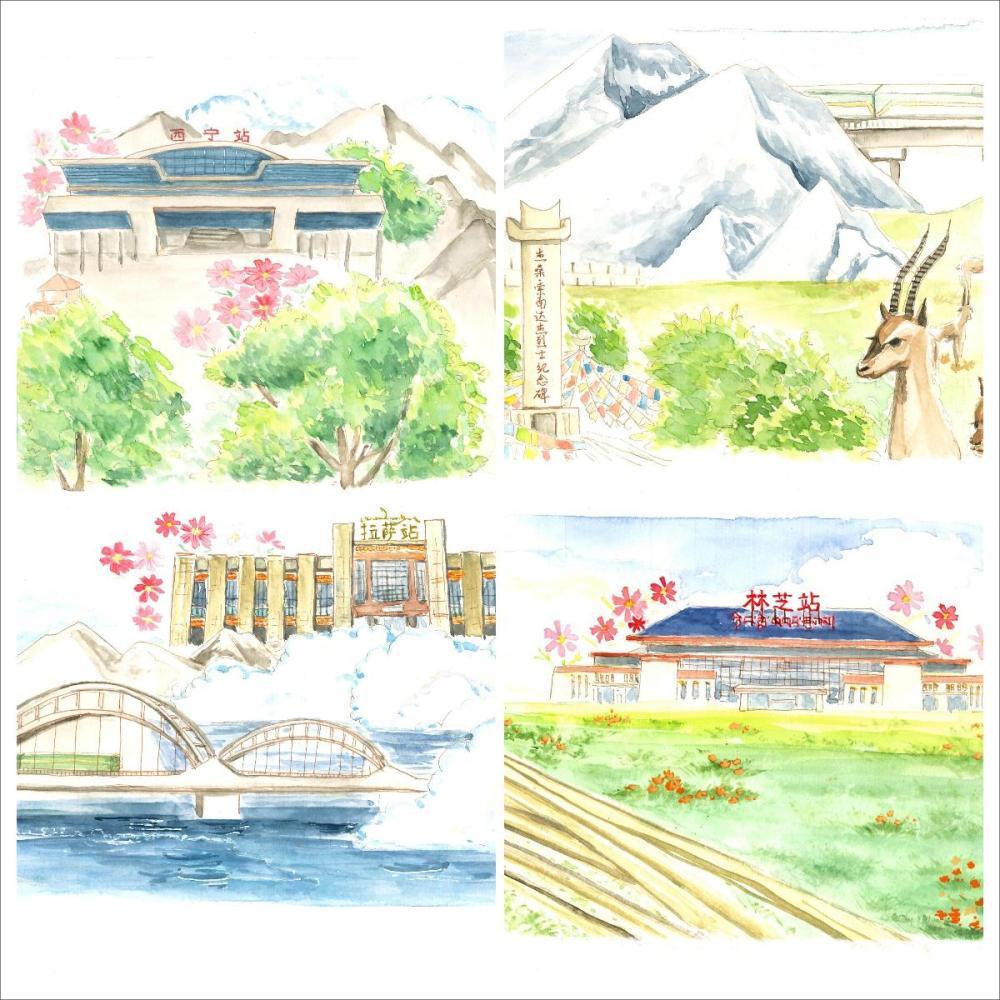 2023年,一組“魅力青藏、幸福天路”的水彩畫讓周源“火出圈”,從西寧站到林芝站,從丹噶爾古城到林芝的桃花林,長長的鐵軌將沿線的景觀特色串聯(lián)起來,構(gòu)成一幅美輪美奐的天路長圖。