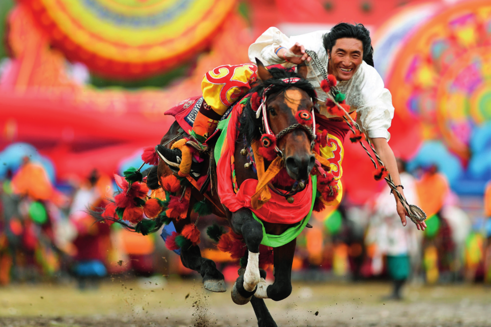 當(dāng)?shù)厝罕娫谟駱?shù)藏族自治州成立70周年慶祝大會(huì)上表演傳統(tǒng)賽馬(2021年8月4日攝)吳剛 攝刊