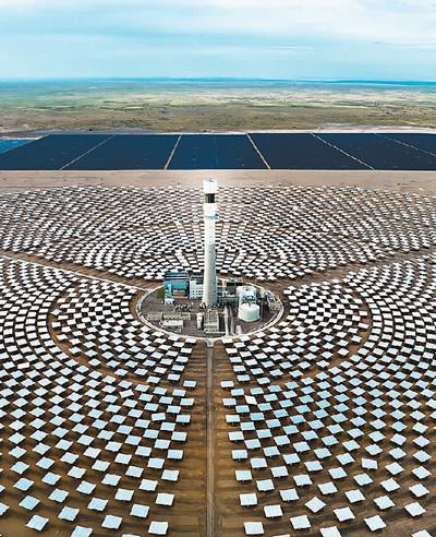 青海格爾木光伏園熔鹽塔式光熱電站,如同盛開在戈壁上的巨大“向日葵”。駱先洋 攝(人民圖片)