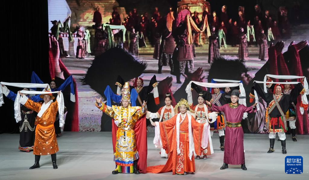 來自青海玉樹藏族自治州嶺格珠民間歌舞團的農(nóng)牧民演員在表演民族團結進步短劇《唐蕃古道》(5月13日攝)。新華社記者 李欣 攝