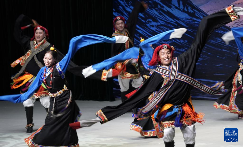 來自青海玉樹藏族自治州的農(nóng)牧民演員在表演《高原踏舞》(5月13日攝)。新華社記者 李欣 攝