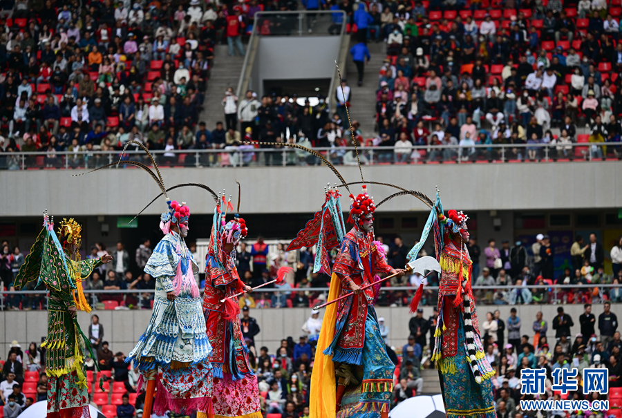 開幕式現(xiàn)場,非遺高蹺走進(jìn)綠茵場。新華社記者 張龍 攝