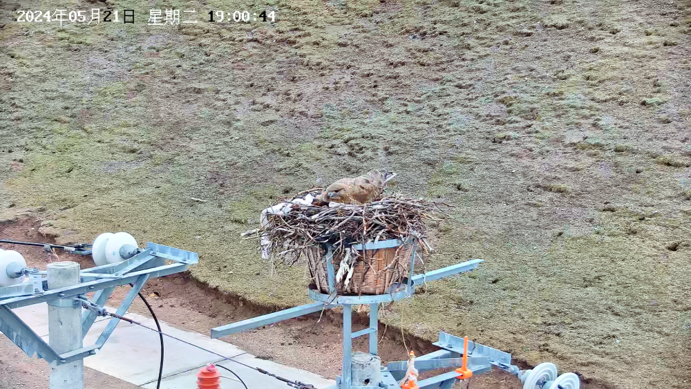 5月21日,在青海省玉樹藏族自治州嘉塘草原的監(jiān)控畫面里,10千伏珍一路的輸電桿塔上,一只大鵟正在孵化幼鳥。(受訪者供圖)
