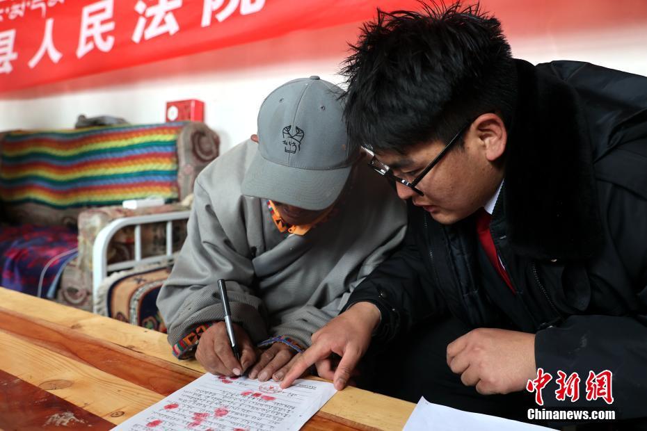 6月3日,在青海省果洛藏族自治州瑪多縣花石峽鎮(zhèn),瑪多縣人民法院“馬背法庭”的法官在牧民家中完成調(diào)解并簽字確認(rèn)。薛蒂 攝