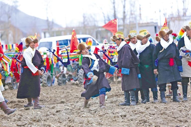 墨竹工卡縣甲瑪鄉(xiāng)龍達(dá)村村民在春耕儀式上開展打牛角活動。