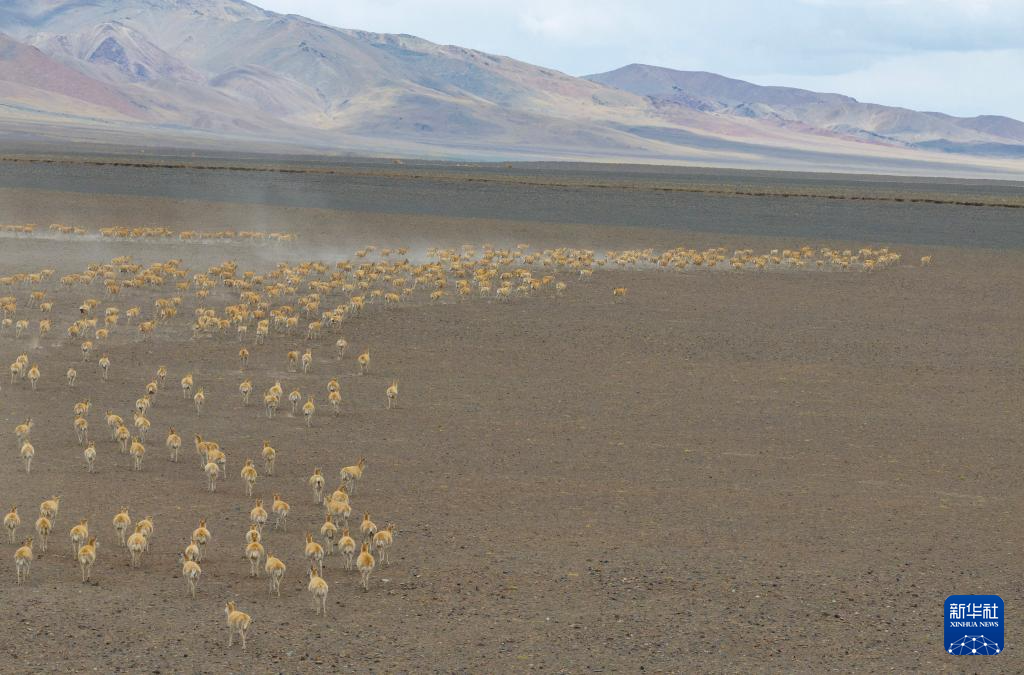 一群藏羚羊因感覺到危險而開始奔跑(無人機照片,6月13日攝)。新華社記者 姜帆 攝