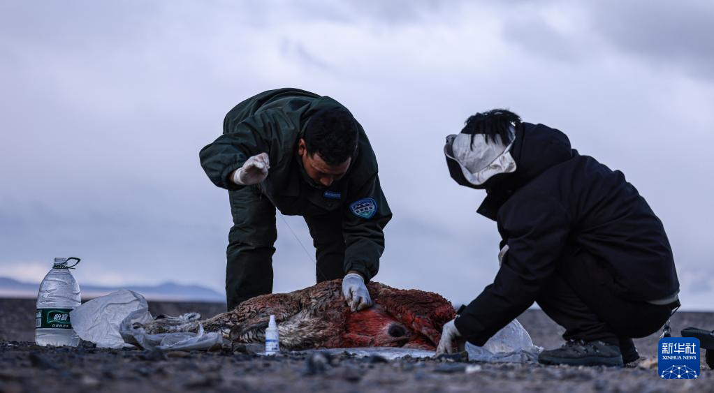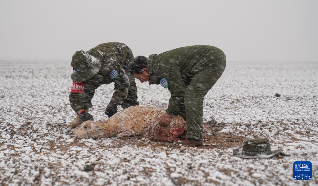 羌塘國家級自然保護區(qū)的野保員在查看受傷的母藏羚羊(6月14日攝)。新華社記者 晉美多吉 攝