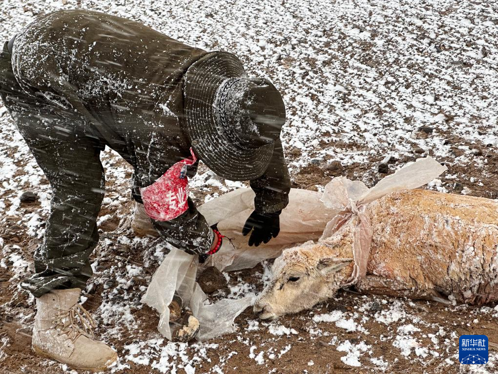 羌塘國家級自然保護區(qū)的野保員在安撫受傷的母藏羚羊(6月14日攝)。新華社發(fā)(旦增攝)