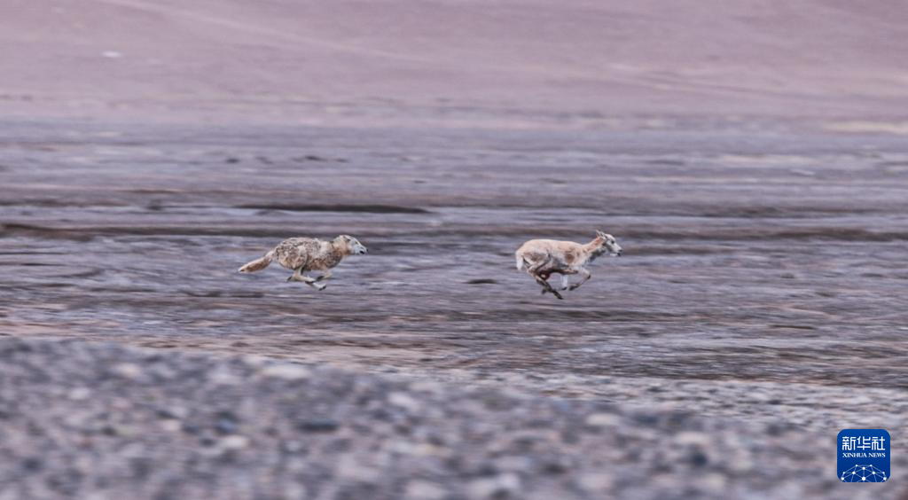 一只野狼奔向遷徙藏羚羊群中一只懷孕的母藏羚羊(6月14日攝,視頻截圖)。新華社發(fā)(達瓦多吉攝)