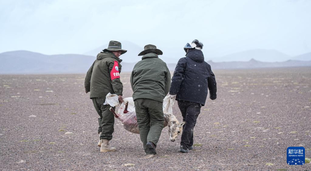 羌塘國家級自然保護區(qū)的野保員把受傷的母藏羚羊抬到臨時營地附近(6月14日攝)。新華社發(fā)(旦增攝)