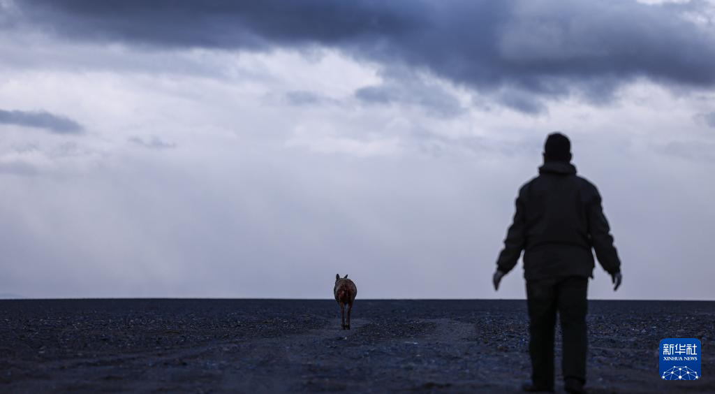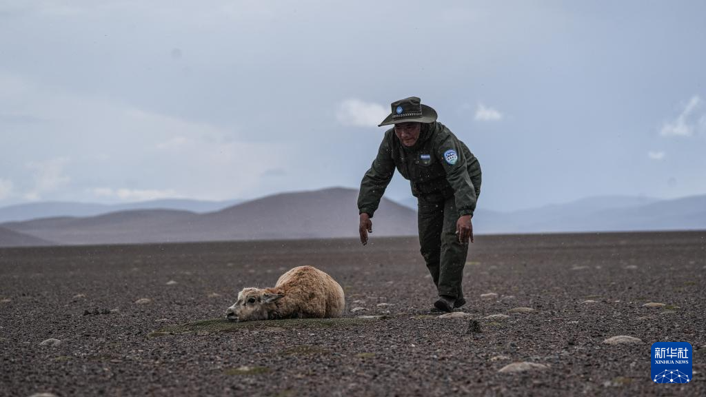 羌塘國家級自然保護區(qū)的野保員上前查看受傷的母藏羚羊(6月14日攝)。新華社發(fā)(旦增攝)