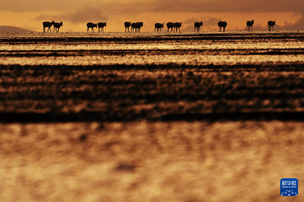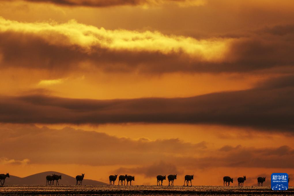 6月14日,在西藏那曲市尼瑪縣境內的羌塘國家級自然保護區(qū)“無人區(qū)”深處,一群藏羚羊迎著朝陽,行進在遷徙路上。新華社記者 費茂華 攝