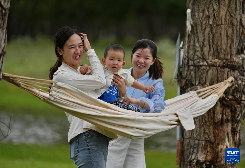 7月14日,游客帶孩子在“神秘樹林”里的吊床上玩耍。新華社記者 張汝鋒 攝