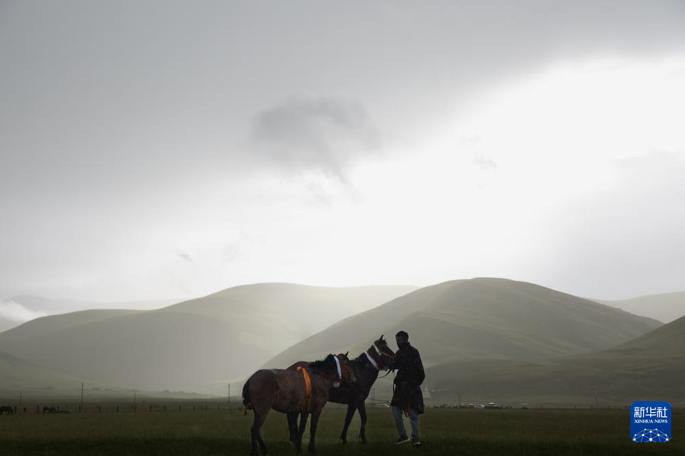 7月27日,兩名藏族群眾牽著馬走進賽場。新華社記者 江宏景 攝