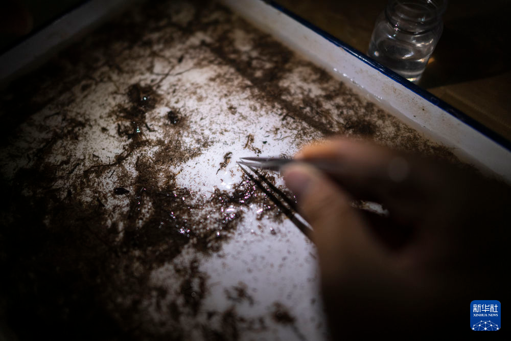 7月24日,在唐古拉山鎮(zhèn)住宿處,科考隊員連夜進行底棲生物挑揀。新華社記者 伍志尊 攝