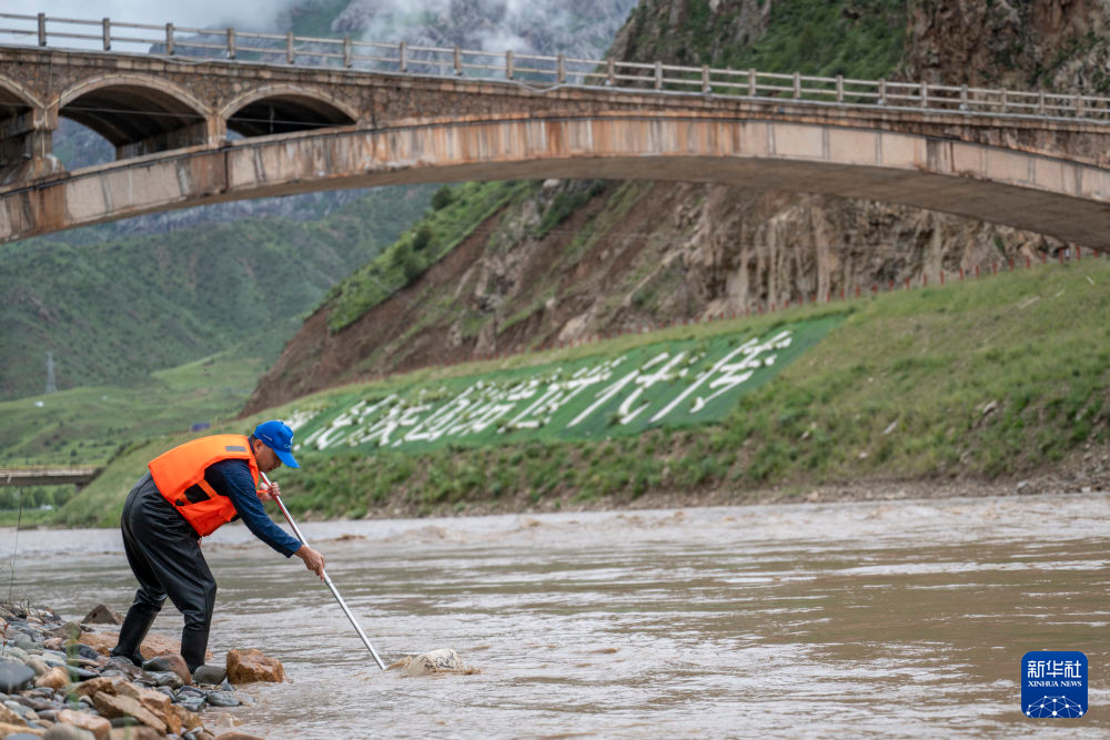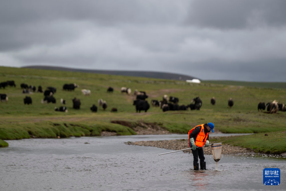 7月25日,在尕爾曲,科考隊員進行底棲生物監(jiān)測采樣。新華社記者 伍志尊 攝