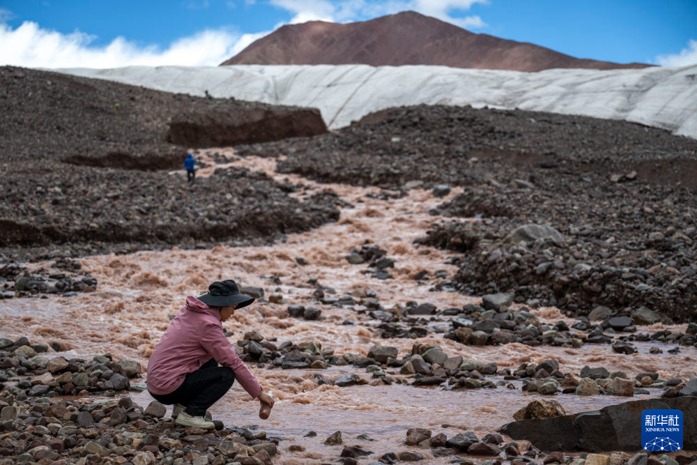 7月25日,科考隊員在冬克瑪?shù)妆ㄟM行水樣采集工作。新華社記者 伍志尊 攝