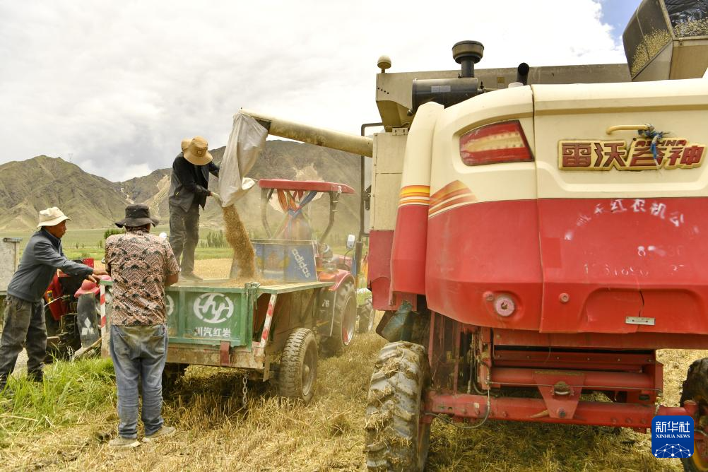 7月31日,聯(lián)合收割機在山南市扎囊縣扎其鄉(xiāng)朗賽嶺村的農田里收割青稞。新華社記者 張汝鋒 攝