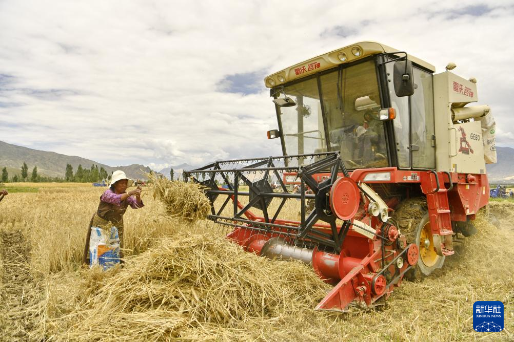 7月31日,聯(lián)合收割機在山南市扎囊縣扎其鄉(xiāng)朗賽嶺村的農田里作業(yè)。新華社記者 張汝鋒 攝