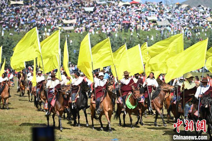 8月4日,藏族騎手在當(dāng)周草原上表演馬隊(duì)巡游。中新社記者 九美旦增 攝
