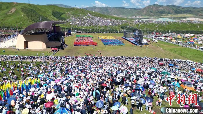 8月4日,人們?cè)诋?dāng)周草原觀看九色甘南香巴拉旅游藝術(shù)節(jié)開(kāi)幕式表演。(無(wú)人機(jī)照片)中新社記者 九美旦增 攝