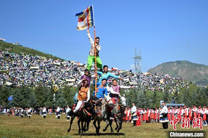 8月4日,藏族騎手在當(dāng)周草原上表演馬術(shù)。中新社記者 九美旦增 攝