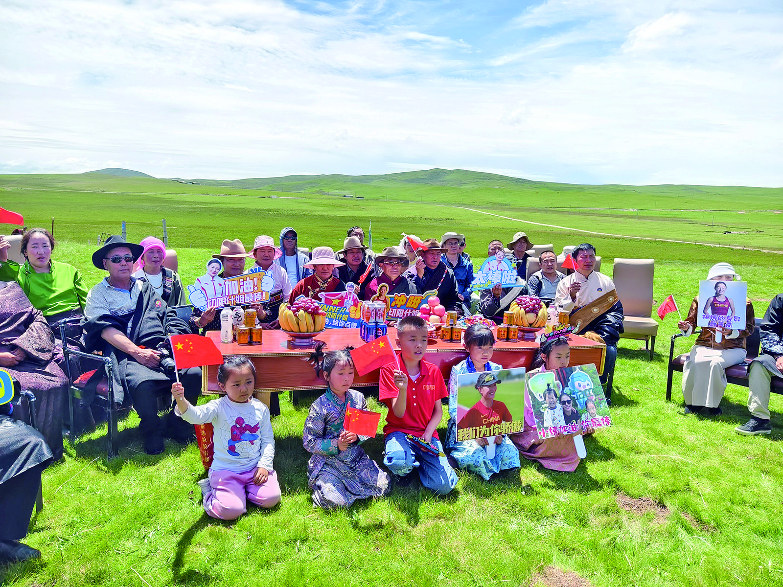 人們因?yàn)橥粋€(gè)心愿相聚在這里,從這里走出去的藏族女孩兒切陽什姐第四次踏上了奧運(yùn)征程。在切陽什姐家旁邊的草地上,海北州廣播電視臺(tái)為了讓大家更好地觀看直播,提前搭起遮陽棚,架起了100英寸的電視機(jī)。