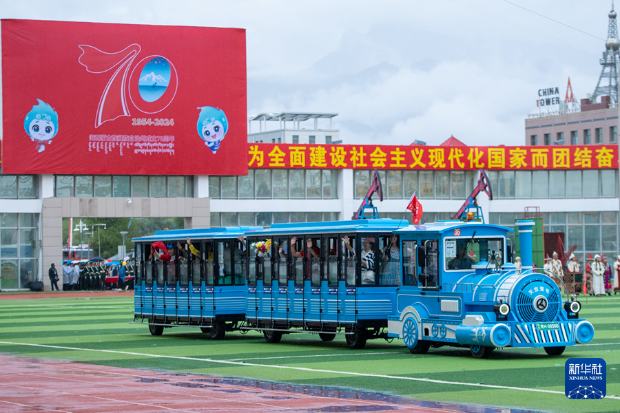 8月8日,在海西蒙古族藏族自治州德令哈市,演員在文藝展演活動上乘坐道具小火車上場。新華社 潘彬彬 攝